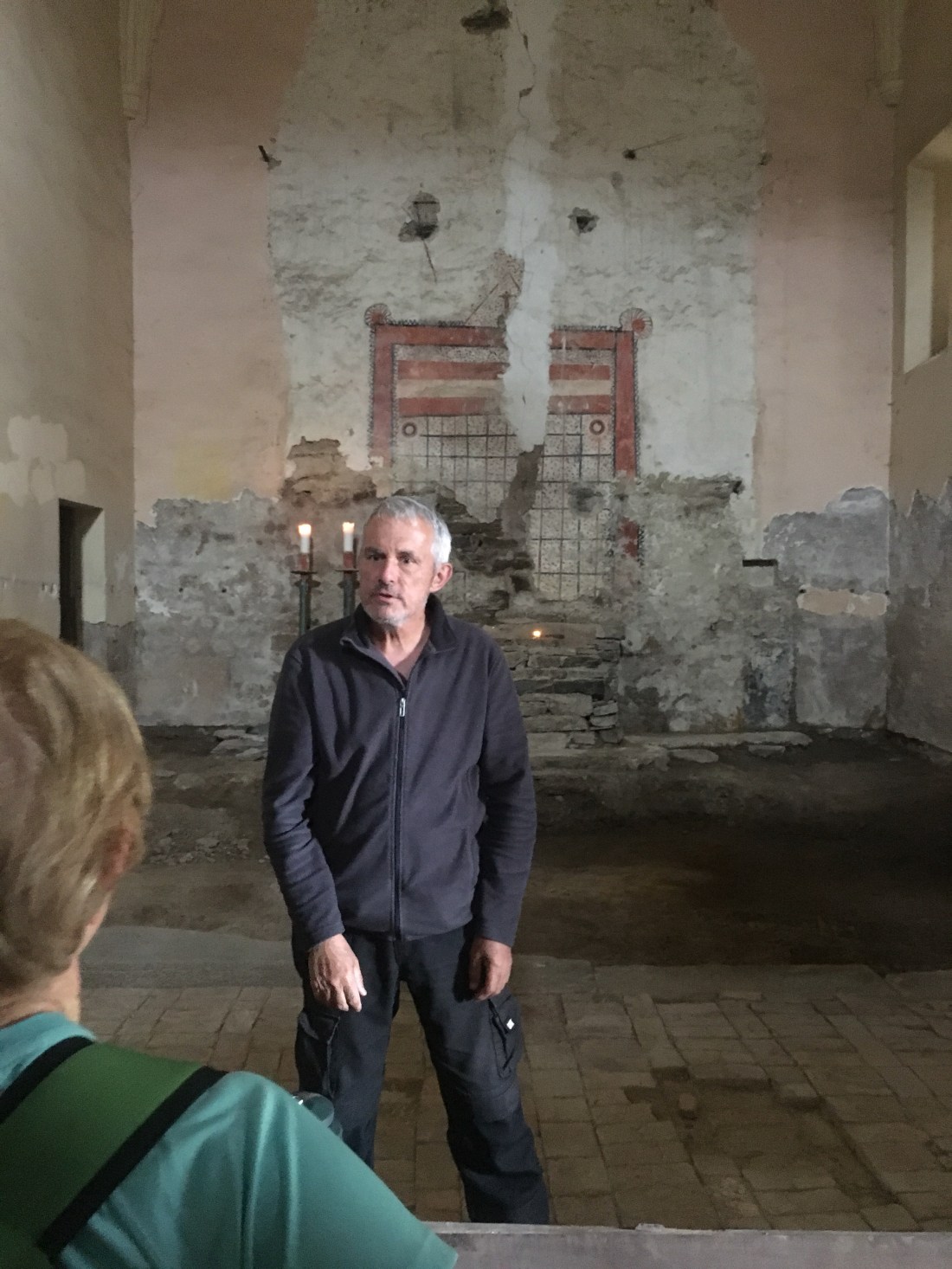 He said the 16th century altar was looted in 2009, but it absence revealed a painted altar on the wall, with pagan symbols of nautiluses and suns. He also pointed out the outside walls are not stone but painted plaster. That’s because the entrance arch was painted with blue stars and other symbols.