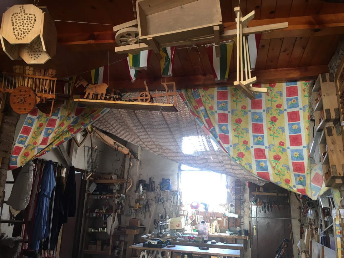 After breakfast we walked to Navarrette. Along the way we passed a fence, where you take sticks and make a cross. Here is mine. We passed the popular bar and were on our way to another when we met Jose Maria, who invited us to his house. He is 90 years old and hand makes wooden signs. He fed us wine and almonds, then gave us a small wooden circle on a stick, with a shorter stick protruding out. It is for opening cans.