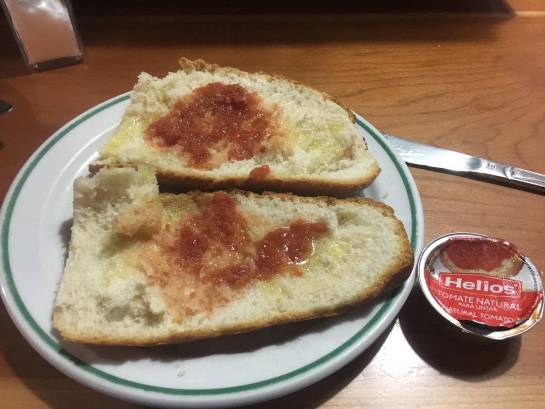 This was breakfast. You smear the tomato on toast, sprinkle it with salt, then pour on oil.