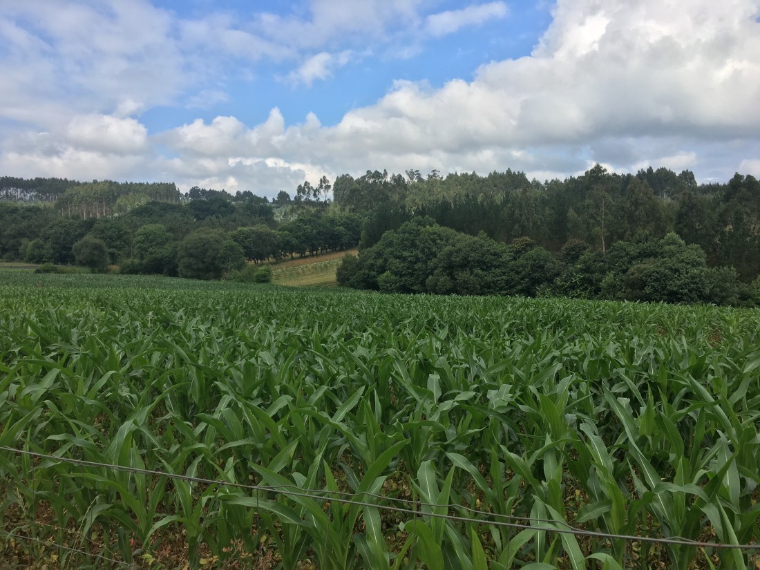 I’ve stopped for breakfast. Toast and cafe con leche and a glass of orange juice. I paid a ridiculous price for it (over seven euros!) but I need fuel. I’ve passed.a group of pilgrims praying the rosary as they walked. At least I think that was it.