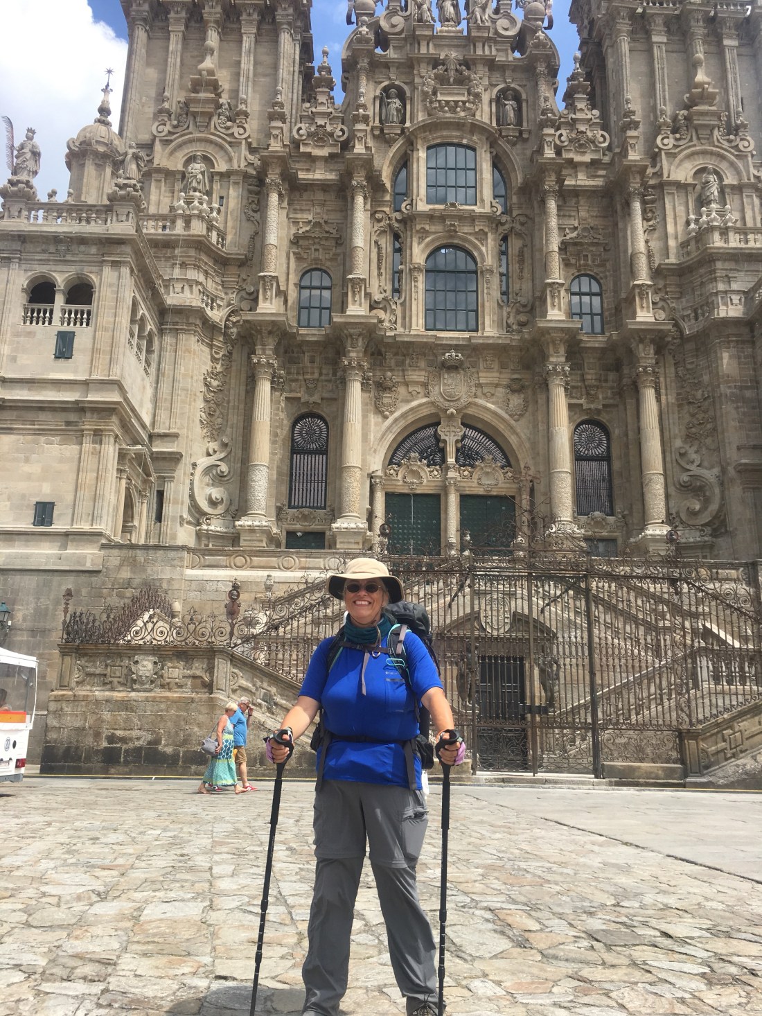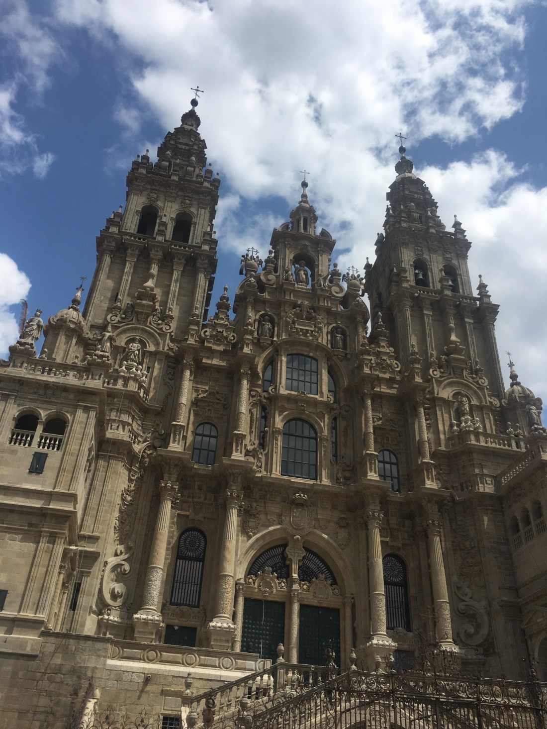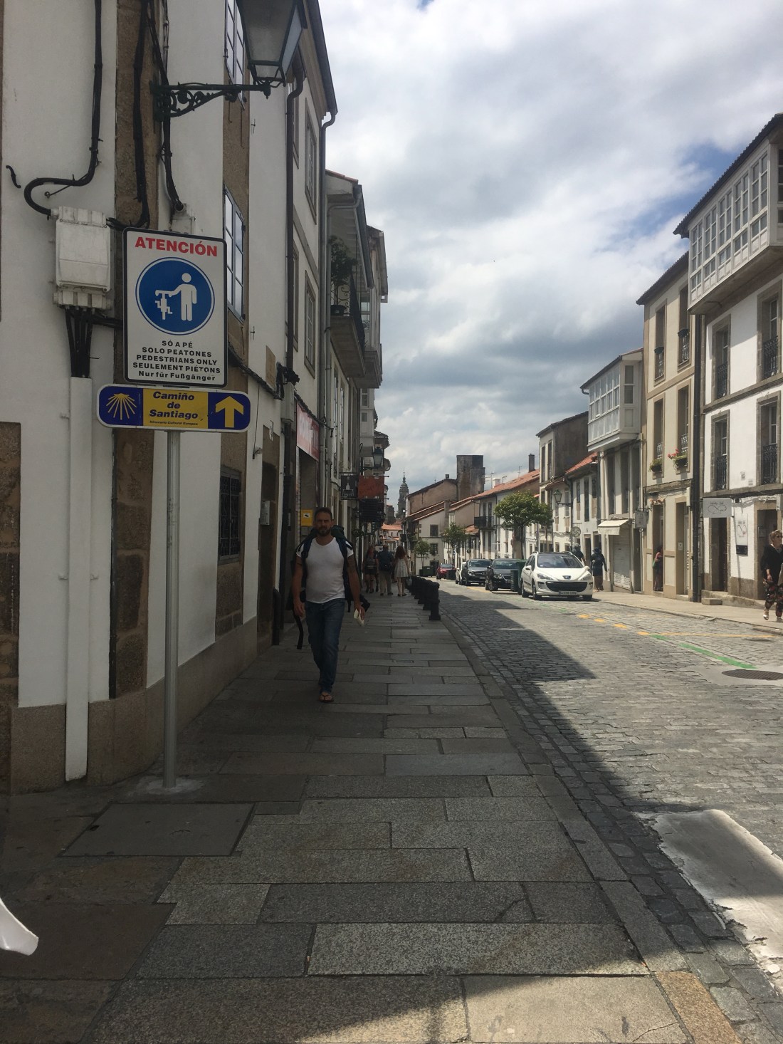 That feels better. I’ve gone all this way with no blisters (other than the one I self-inflicted) and I’m not going to start now. I still have seen no one I know and I’m losing hope I will. It’s okay. A stranger took my picture at the 100k marker and a stranger can take it again at the cathedral.