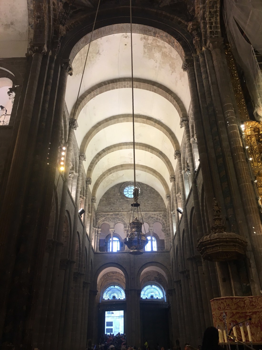 The botafumerio rises and begins to swing. It’s path isn’t smooth, as I expect. It clunks and thunks a bit. I take some video (everyone else is) but I don’t want lose the moment by videoing it. I want to be IN it, experiencing it fully. So after a burst where I get the botafumerio at its peak, I stop and just experience the moment.