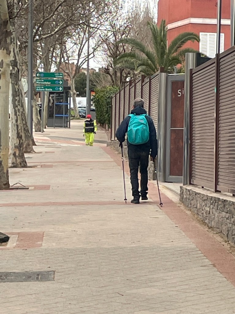 So I figured,”Find a major street and there’ll be an ATM.” Ummm, no. I walked over a mile down Calle de Silvano (a street people kept telling me about yesterday) and never saw one. I had to turn on Calle de Canillas (another major street) before I found one. On the way I passed a man with my hiking poles who wasn’t a pilgrim. I wanted to bring mine but there wasn’t room.