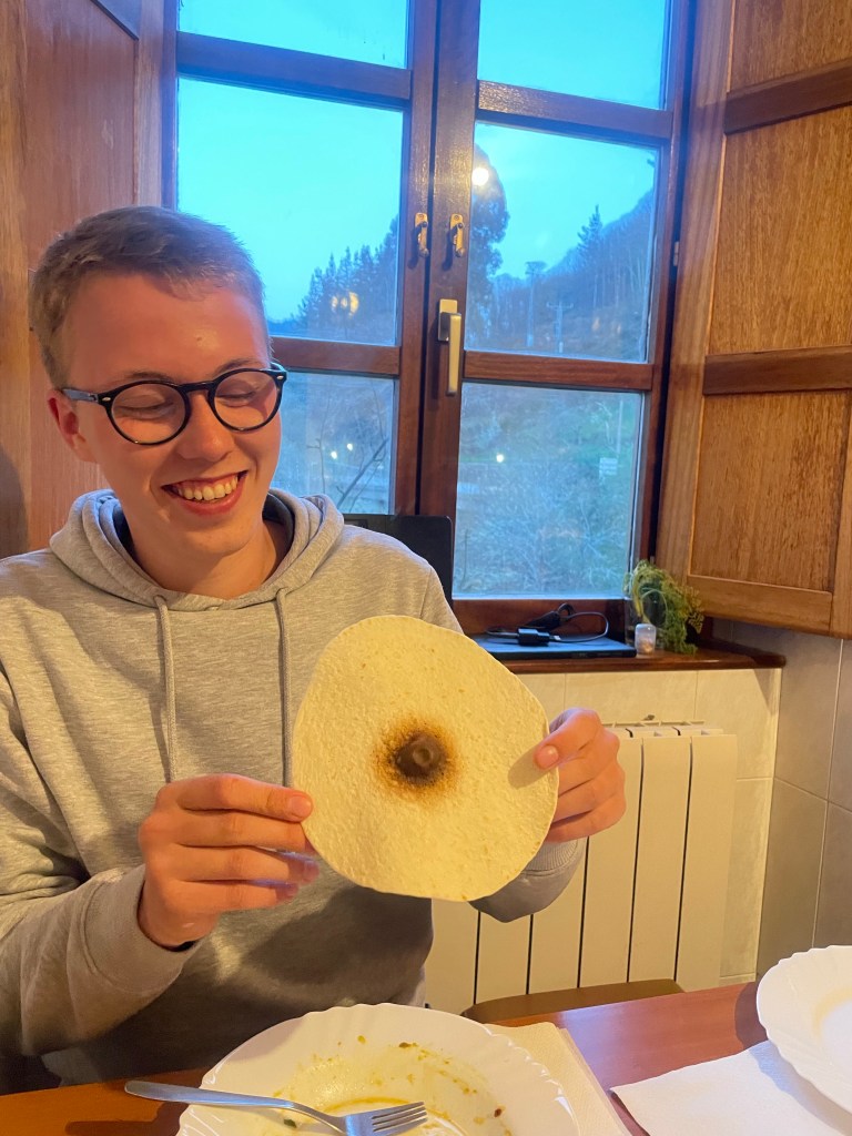 He first wore it as a hat(it was that crisp and the black part stuck up like the crown of a sombrero) then ate around the burned part.